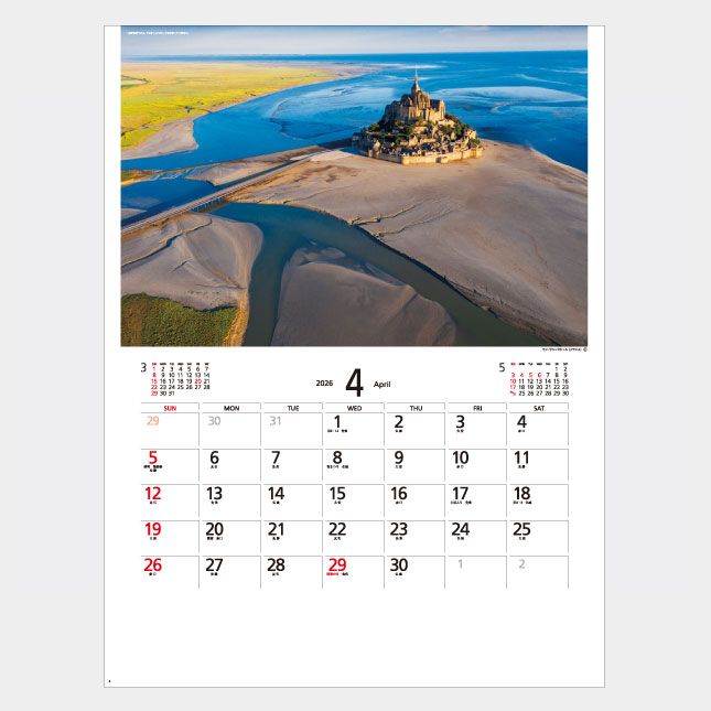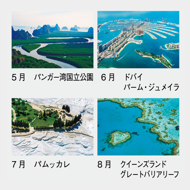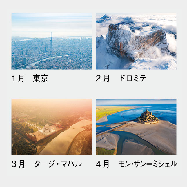 あたかも鳥になったように、空からの撮影〈空撮〉で世界をめぐる、13枚綴りのカレンダーです。