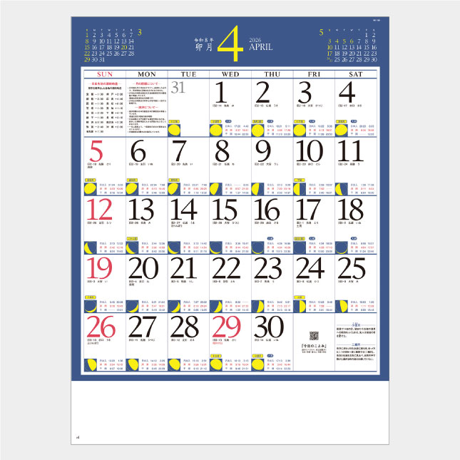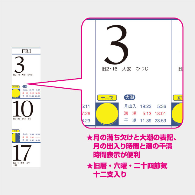 月の満ち欠けや大潮の表記に加え、潮の干満時刻まで掲載されているため、釣りや海のレジャーを楽しまれる方にも便利なカレンダーです。さらに旧暦・六曜・二十四節気・十二支を盛り込み、日常生活や行事の予定管理にも幅広く活用できます。