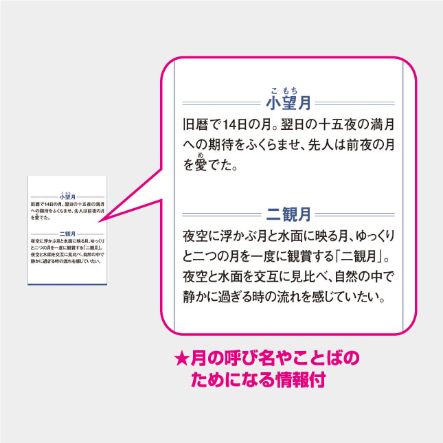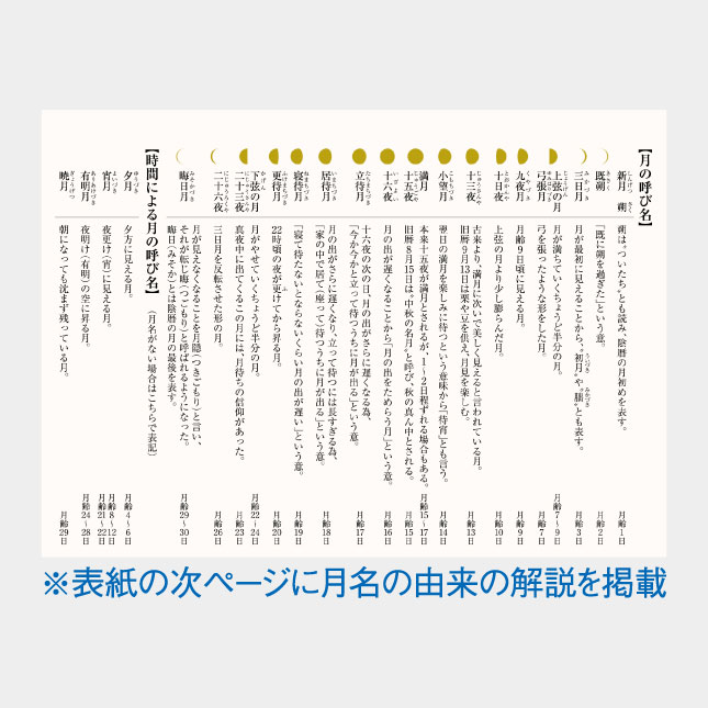 毎月のページには「月の呼び名」や「月にまつわる言葉」など、ためになる情報も掲載されており、見ているだけで日本の文化や季節の移ろいを感じられるのも魅力です。まさに“月と共に暮らす”ための実用性と知識が詰まった一冊です。