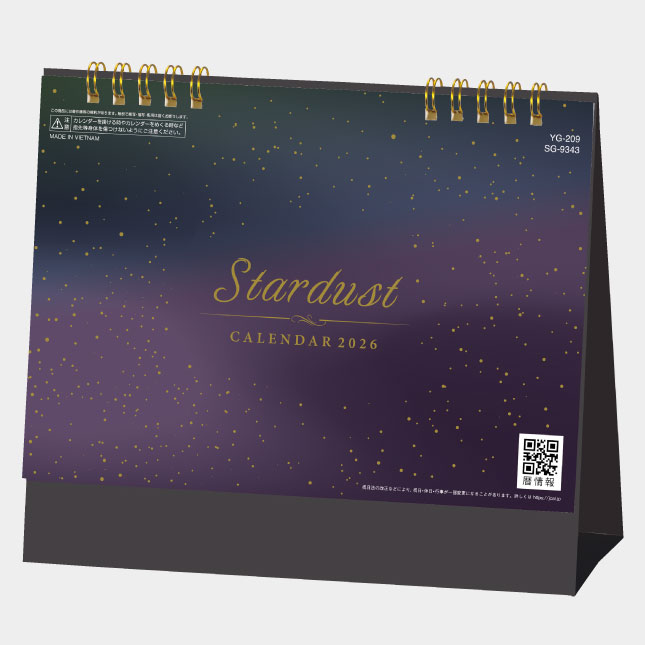 夜空を背景に、星々の輝きとカレンダーを豪華な金の箔押しで仕上げた、特別感あふれる卓上カレンダーです。角度によってきらめく箔の輝きが、まるで本物の星空を切り取ったかのような美しさを演出します。