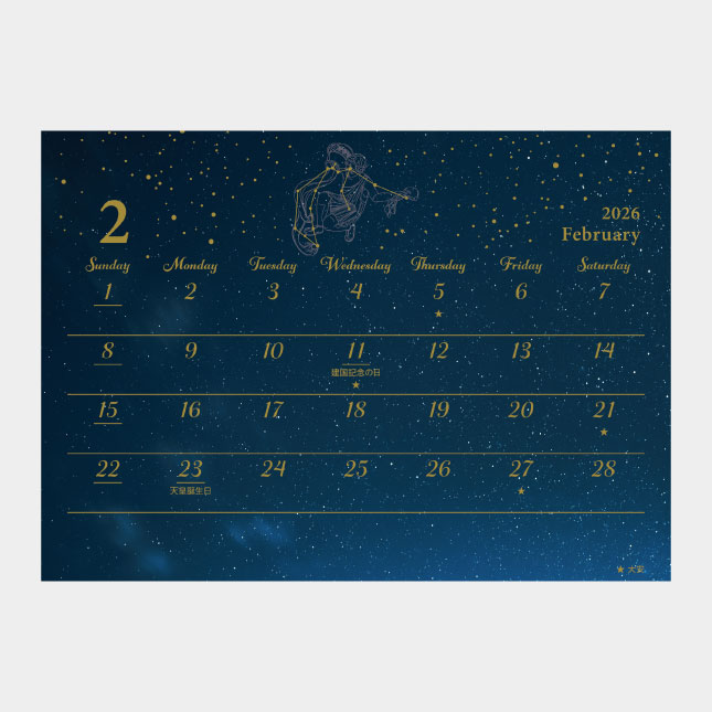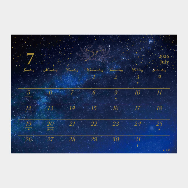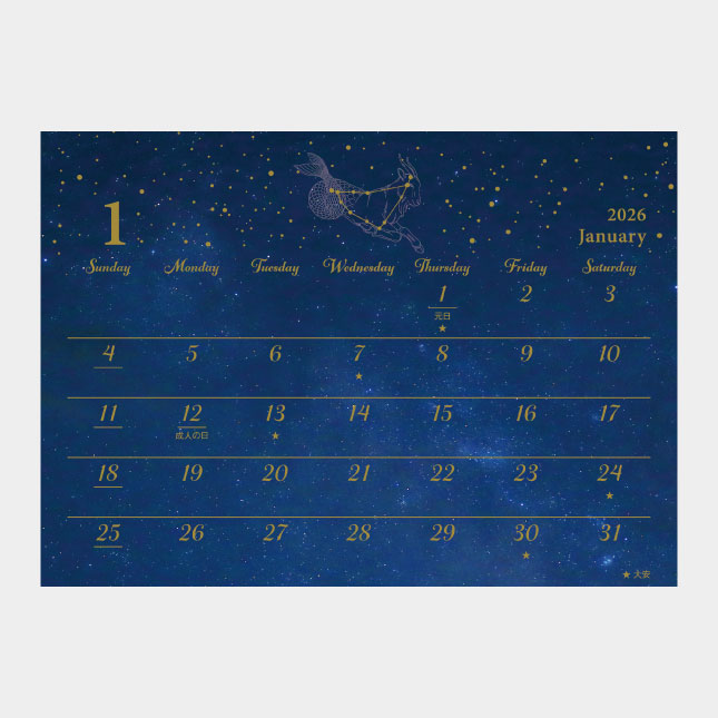 各月にはその季節の星座を掲載し、日常の中で星空を身近に感じられるのも大きな魅力。さらに、大安の日には星形のシンボルが入っており、実用性と遊び心を兼ね備えたデザインになっています。