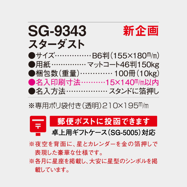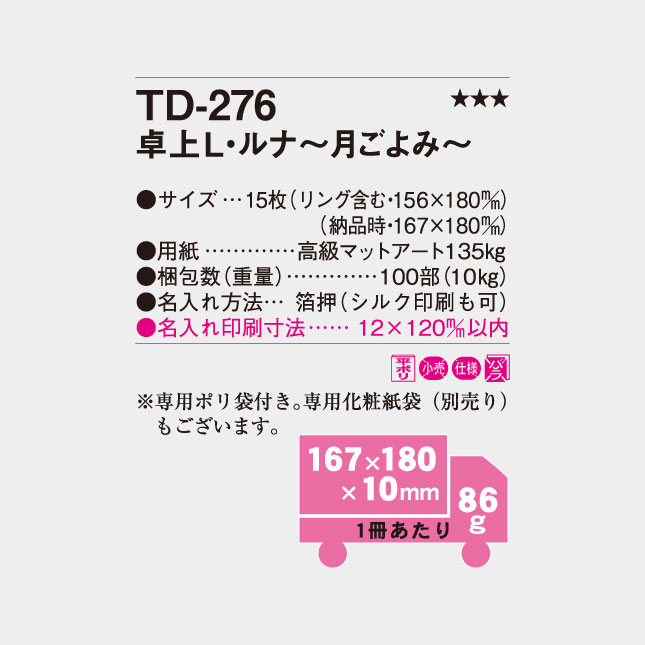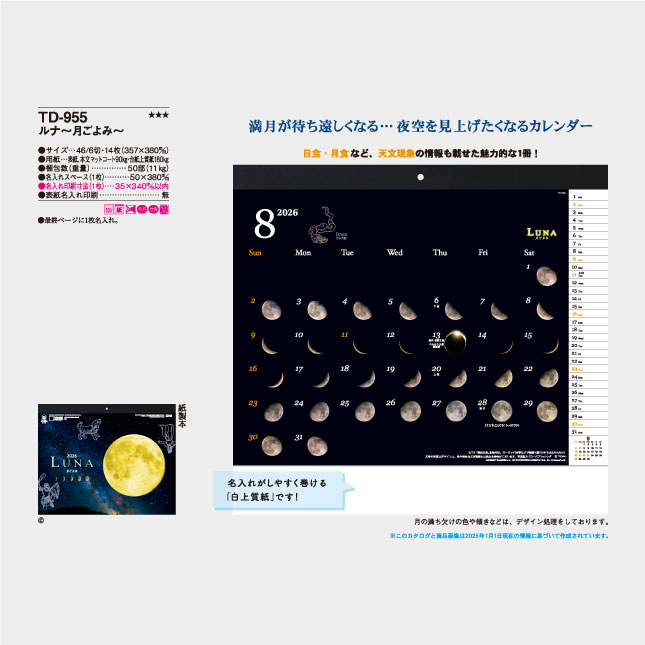 販促品としては、毎日目にする実用性の高さに加え、金箔やデザイン処理で表現された幻想的な月や星の美しさが、特別感を演出します。1年間を通じて企業名を自然に印象づけられるだけでなく、「センスの良い贈り物」として受け取った方の心に長く残るでしょう。