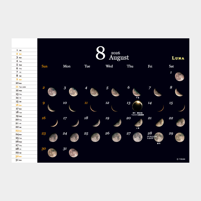 月の満ち欠けを毎日眺めながら、次の満月を楽しみに過ごせる――そんな気持ちにさせてくれる、ロマンあふれるカレンダーです。さらに日食・月食など、注目の天文現象の情報も掲載されており、空を見上げるきっかけを与えてくれる魅力的な1冊に仕上がっています。