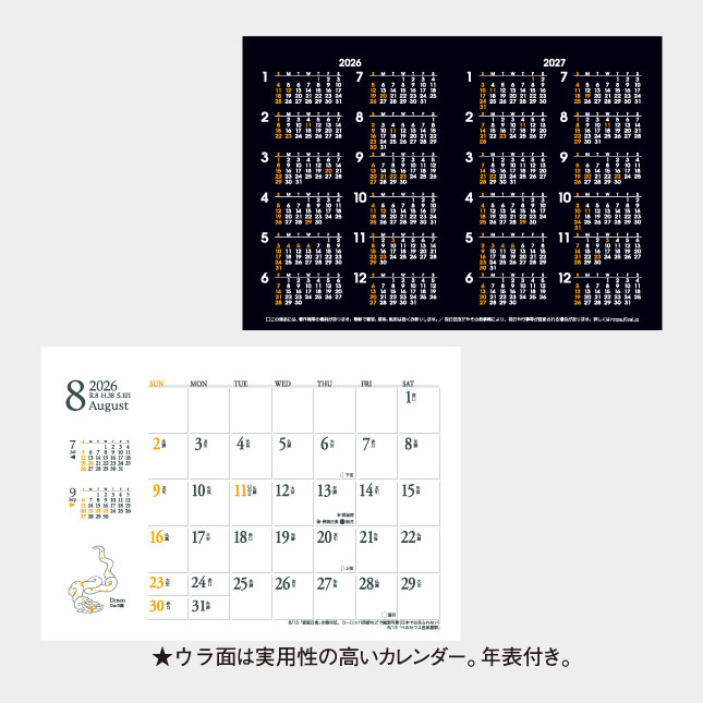 さらに、裏面には実用性の高いカレンダーを配置し、年間を通して予定管理がしやすい年表も付属。デザイン性と実用性の両立を実現した、使う人に嬉しい一冊です。