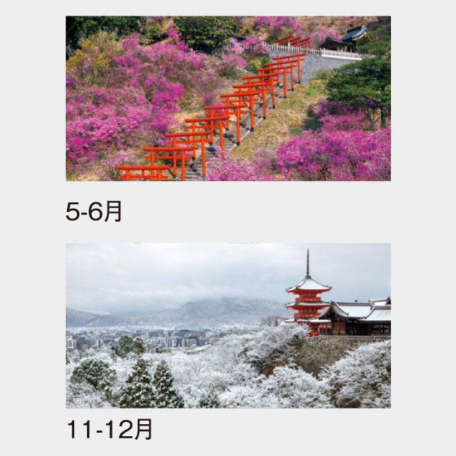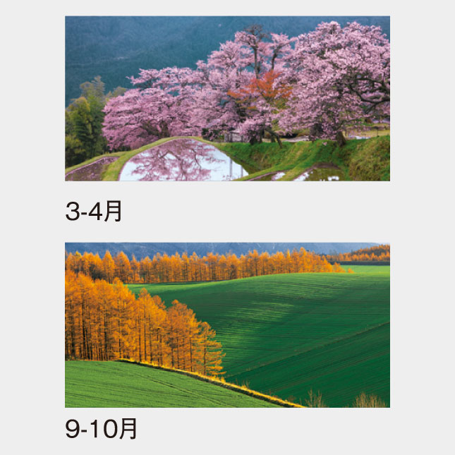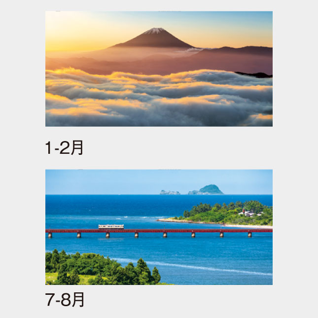日本の美しい風景を季節ごとに配し、こよみにはメモを書き込み易くメモ欄を広く取り、使いよくした実用向のカレンダーです。