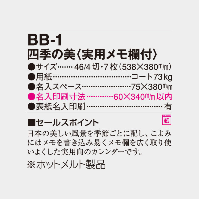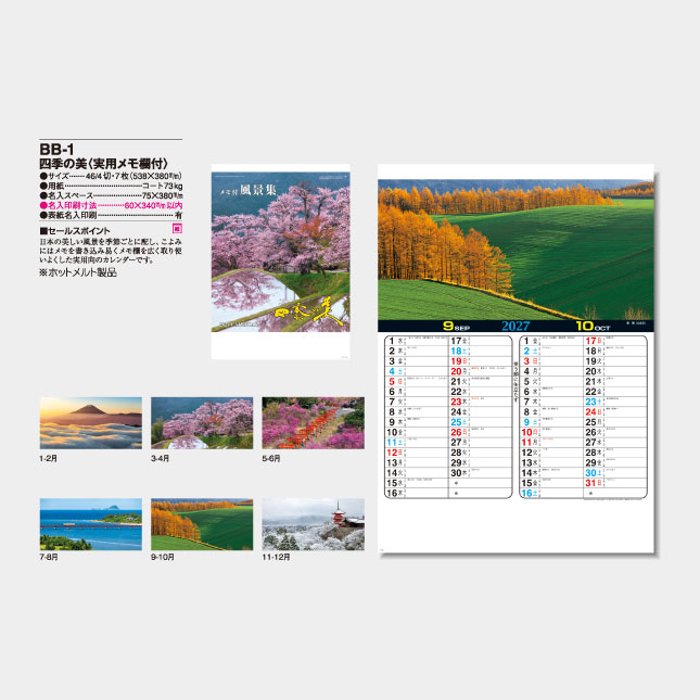 BB-1 四季の美(実用メモ欄付) 壁掛け名入れカレンダー