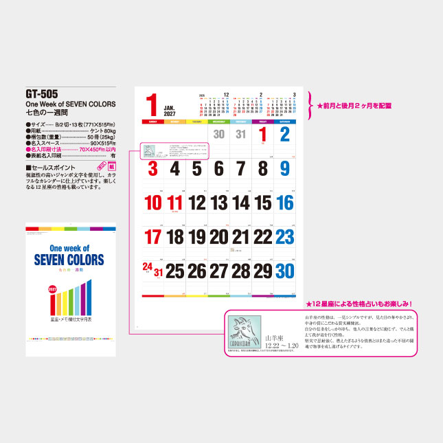 掲載価格は基本色1色です。「名入れ印刷色について」ページをご確認ください。壁掛けの2色以上のカラー刷り・価格表にない冊数についてはお見積をご依頼ください。 |