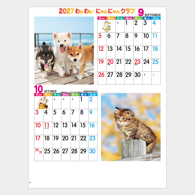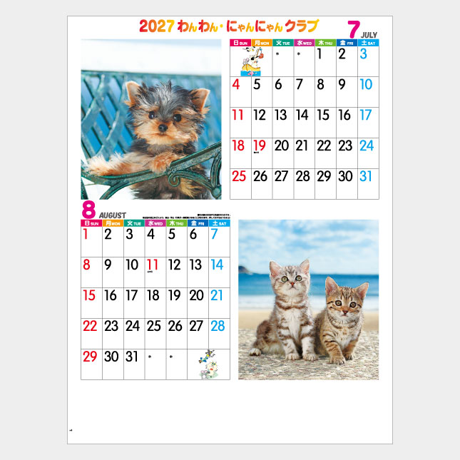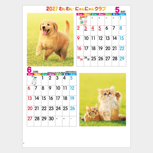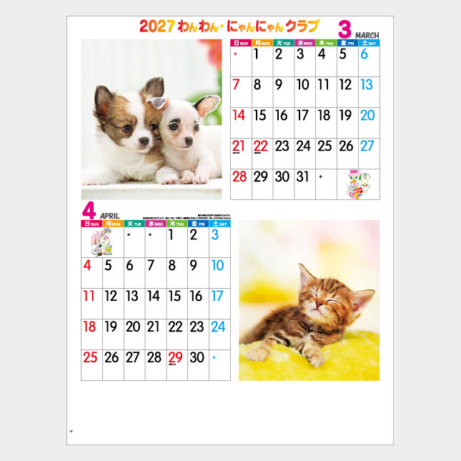 わんわん・にゃんにゃん。愛らしいハーモニーが聞こえてきそうなカレンダー。かわいい子犬と子猫が毎ページ見られます。メモ欄も大きくとった犬・猫カレンダーの定番!