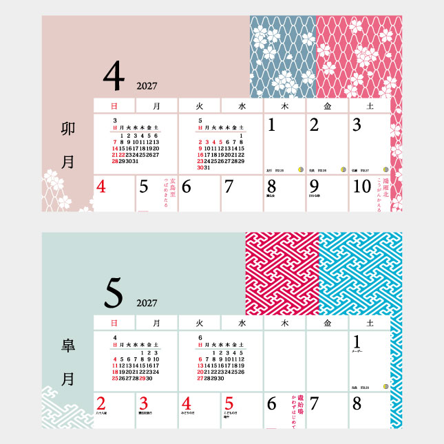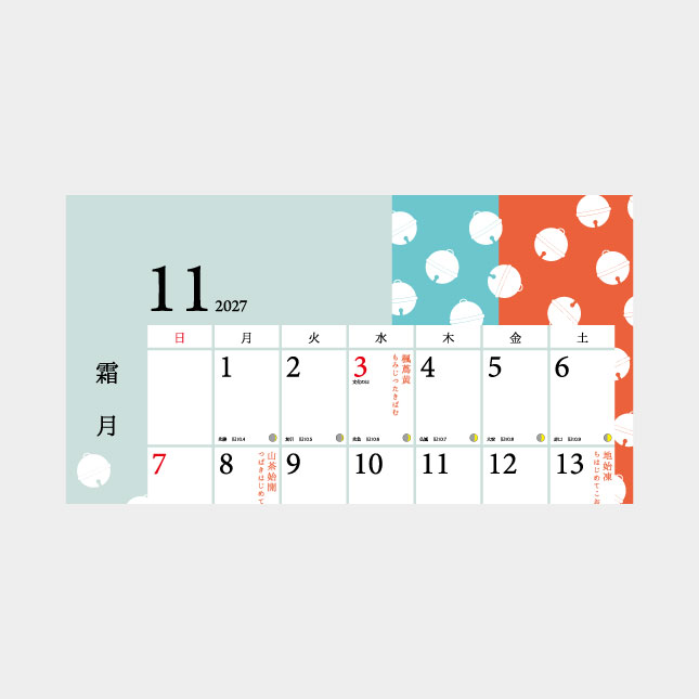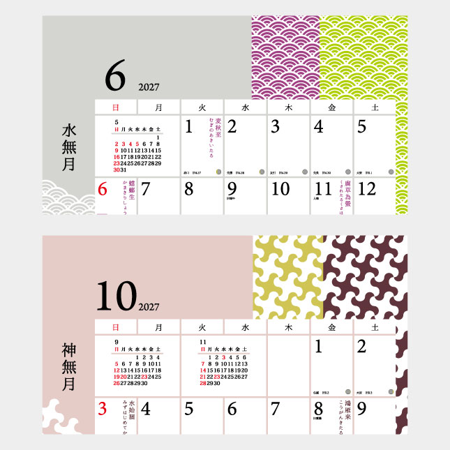 二十四節気、七十二候は縦書きで、七十二候はひらがなでわかりやすく表記しています。また各月の伝統文様の名称も表記してあります。
