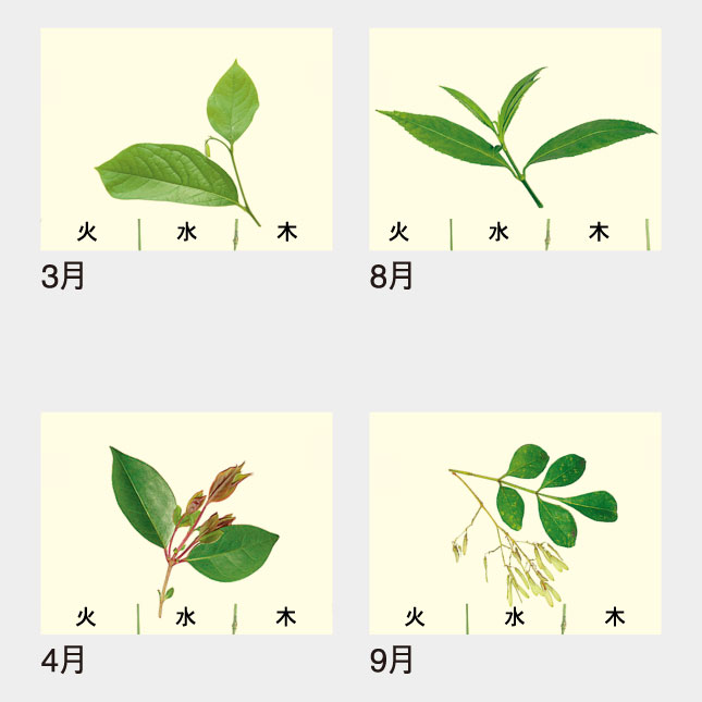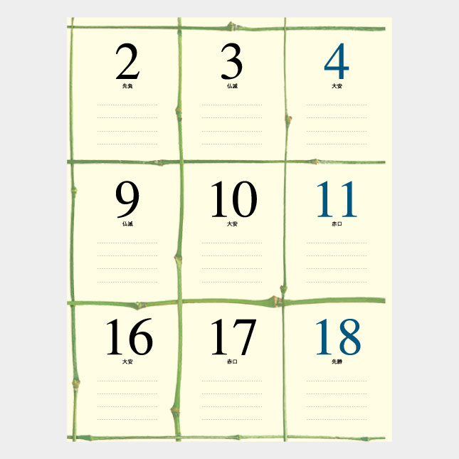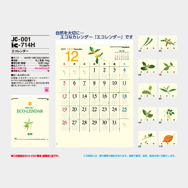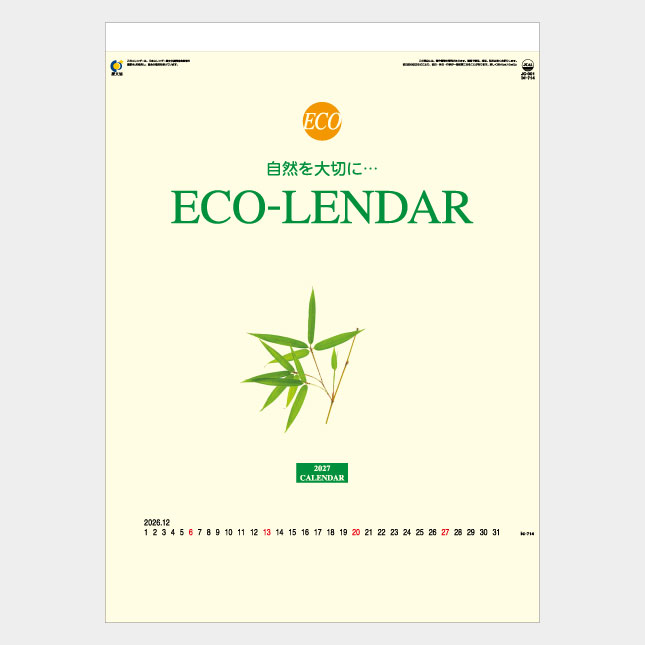 目にやさしいクリーム色の用紙に、植物の茎でケイをデザインし、カレンダー全体でエコを表現しています。