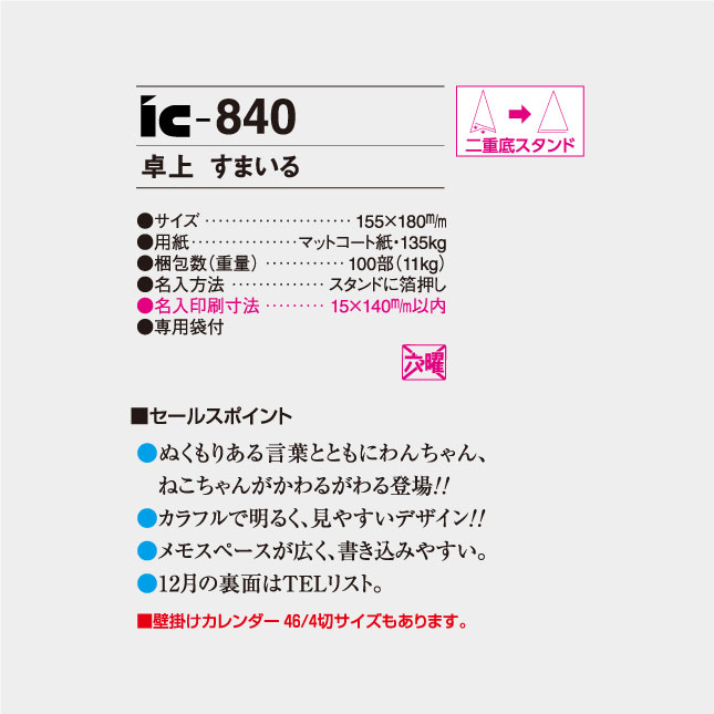 IC-840 卓上名入れカレンダー すまいるの特徴