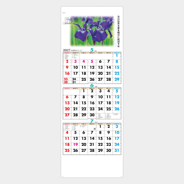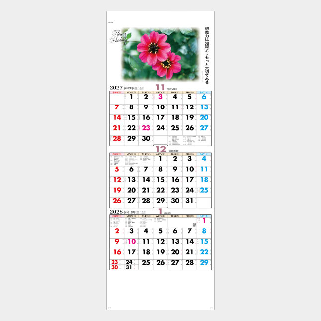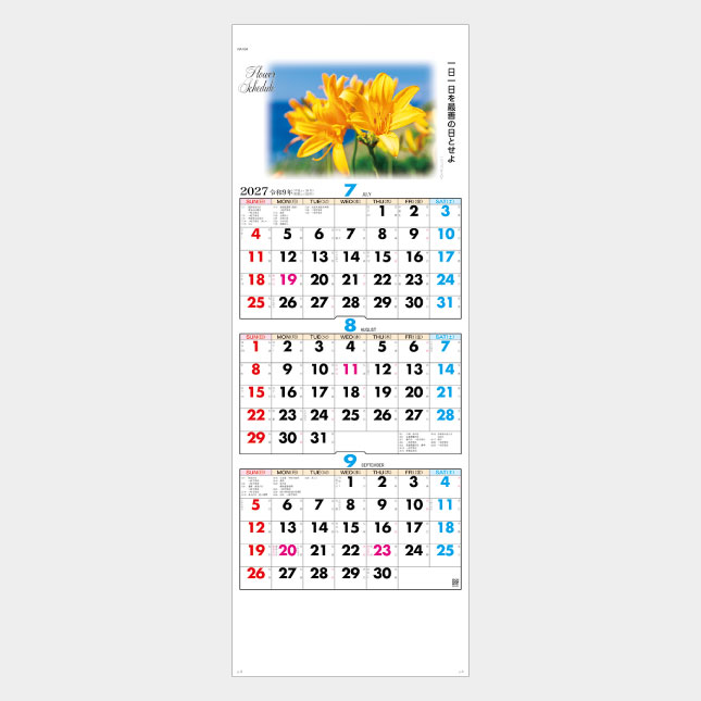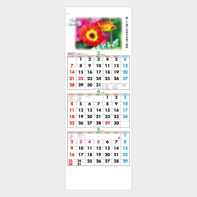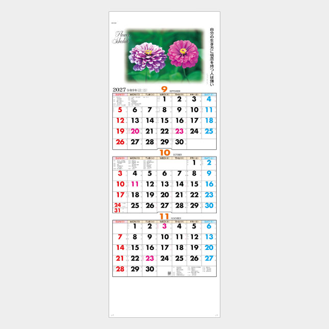 色鮮やかな季節の花が癒しを与えてくれるコンパクトな三ヶ月カレンダーです。格言入りです。