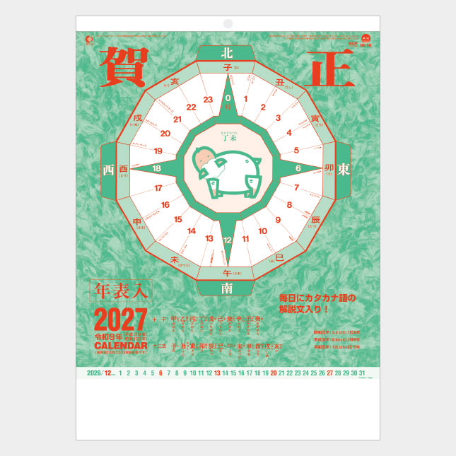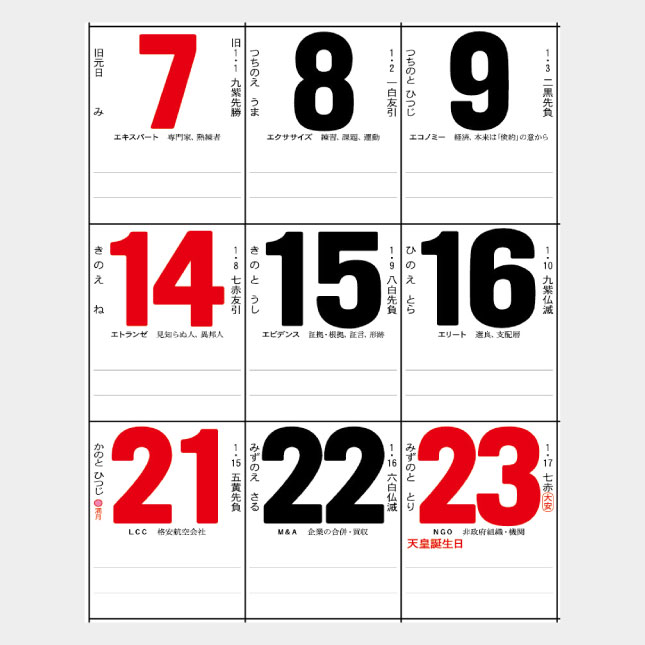 翌月を大きくし、以降は順に先々へ進む年表を配した実用カレンダーです。毎日にカタカナ語の解説文入りです。