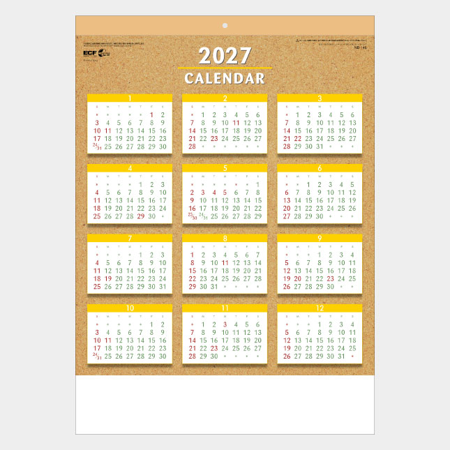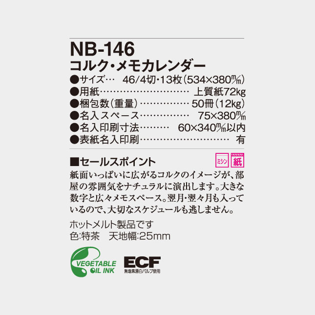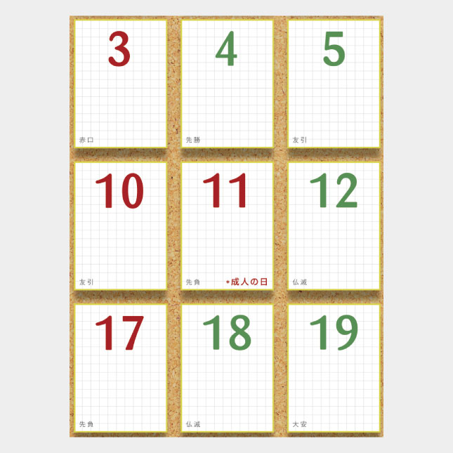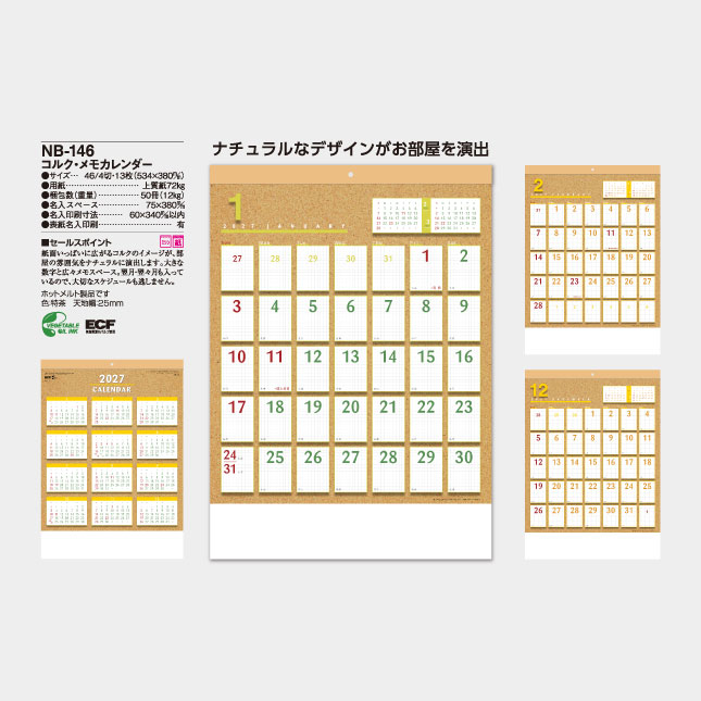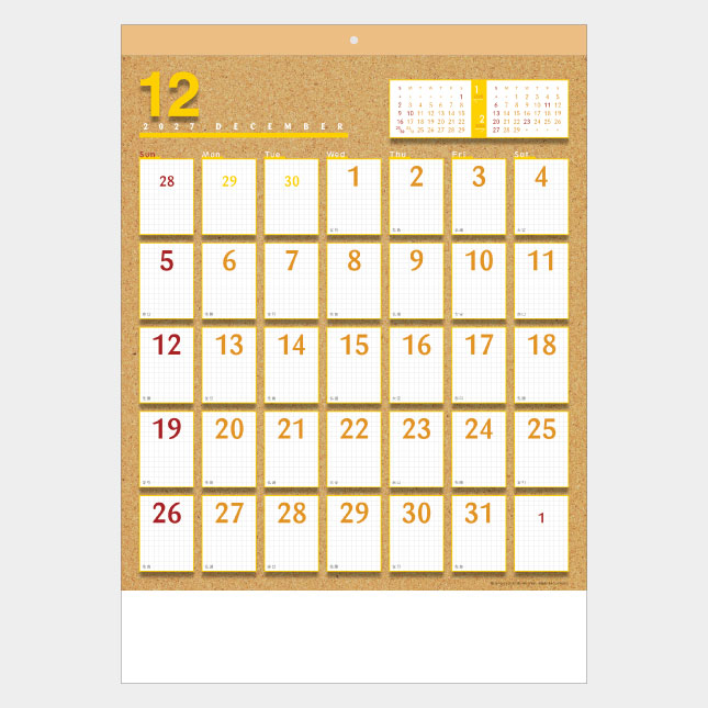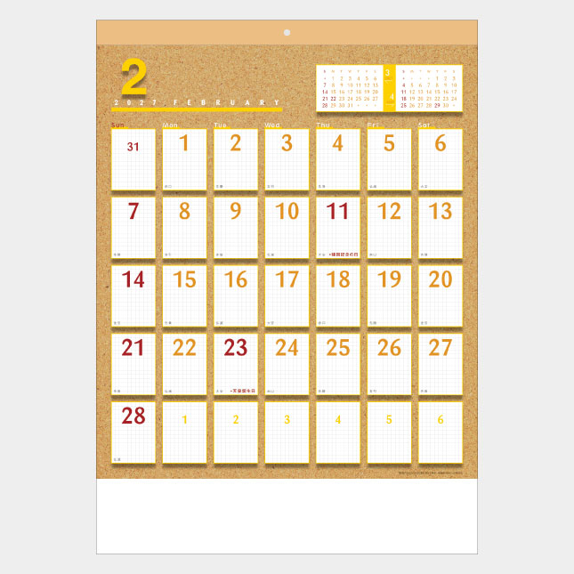 紙面いっぱいに広がるコルクのイメージが、部屋の雰囲気をナチュラルに演出します。大きな数字と広々メモスペース。翌月・翌々月も入っているので、大切なスケジュールも逃しません。