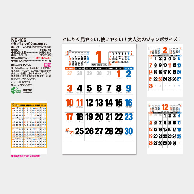 NB-186 3色・ジャンボ文字(前後月)名入れカレンダーの特徴