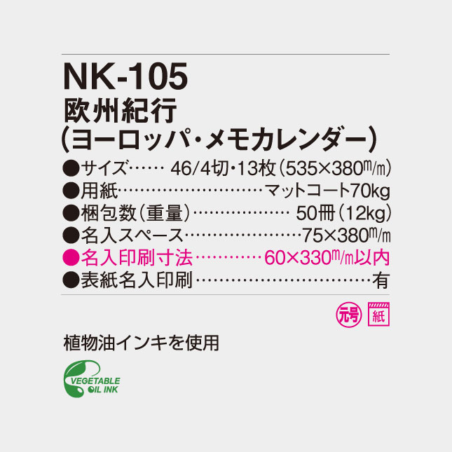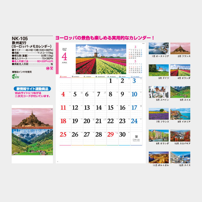 NK-105 欧州紀行(ヨーロッパ・メモカレンダー)壁掛け名入れカレンダー