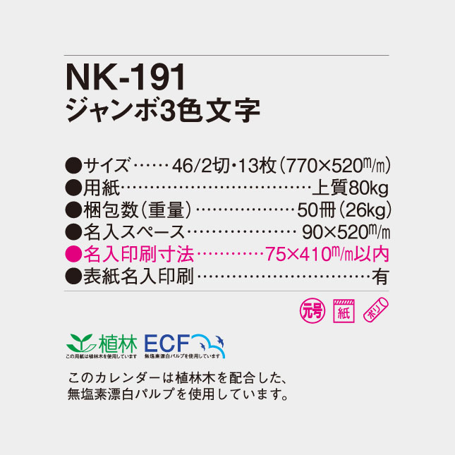 NK-191 ジャンボ3色文字 文字月表 名入れカレンダー