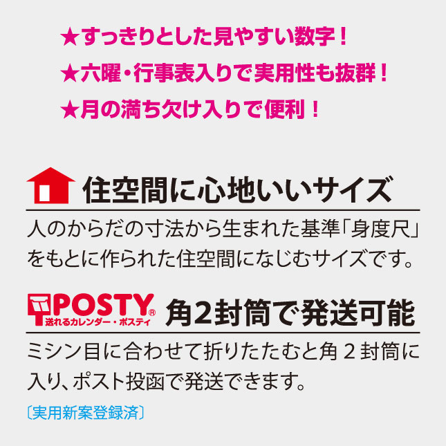 すっきりとした見やすい数字!六曜・行事表入りで実用性も抜群!