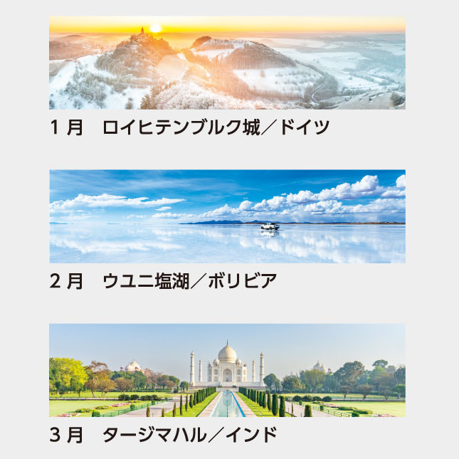 カラフルですっきりしたデザインのパノラマ世界風景写真が魅力。