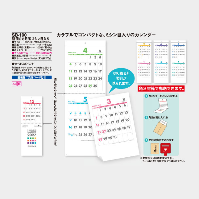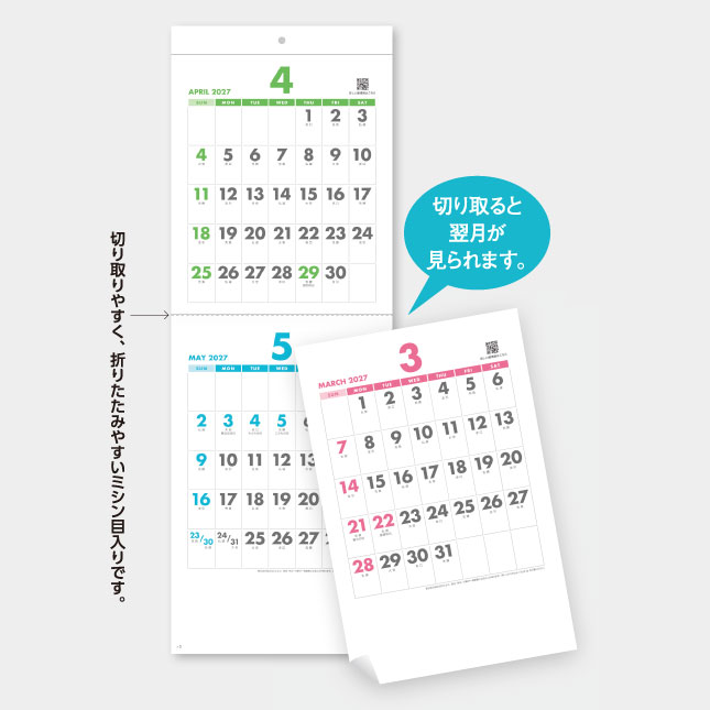 毎月色変わりするカラフルな配色と、見やすさが魅力。切り取りやすいミシン目入りで、常に後月が見られる便利な短冊カレンダー
