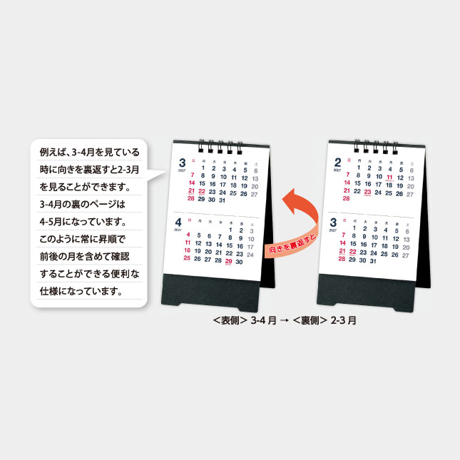 上から昇順の組み合わせで2カ月を確認するプチサイズの卓上カレンダー。