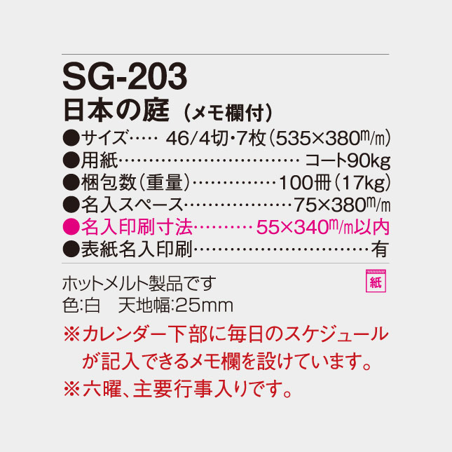 SG-203 日本の庭(メモ欄付) 壁掛け名入れカレンダー