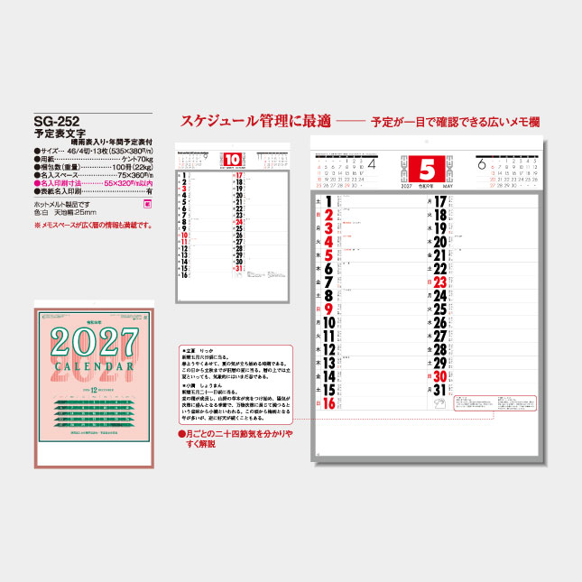 | 商品名 | SG-252 予定表文字 晴雨表入り・年間予定表付(YG-42) |