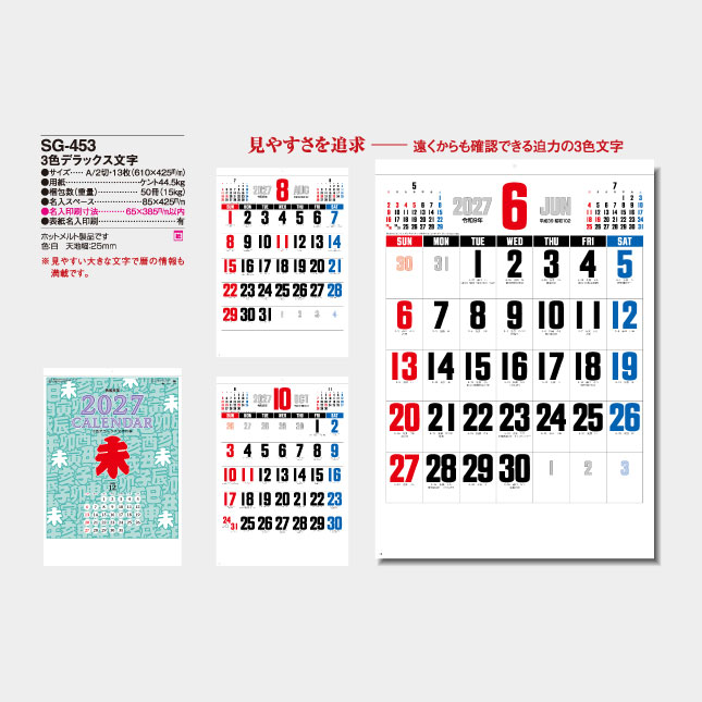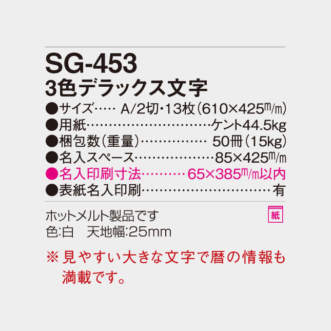 SG-453 3色デラックス文字 文字月表 名入れカレンダー