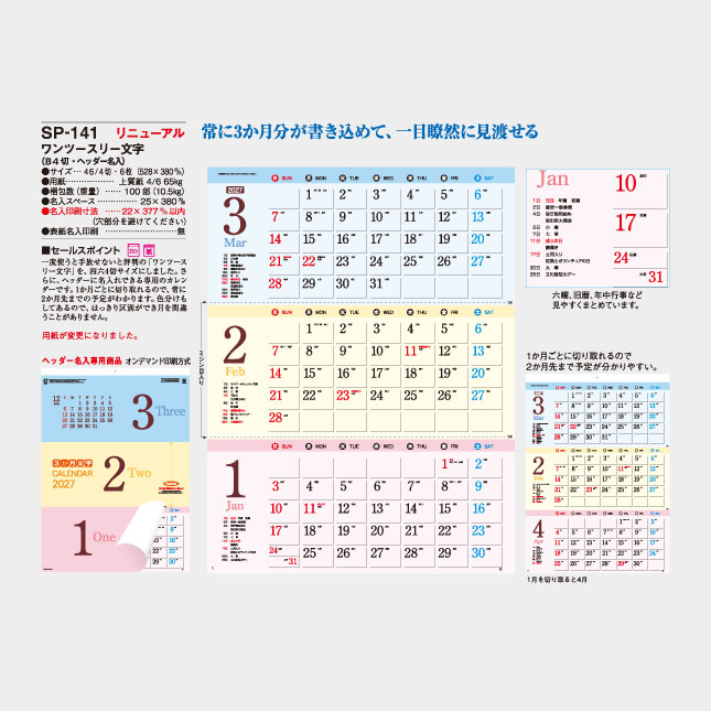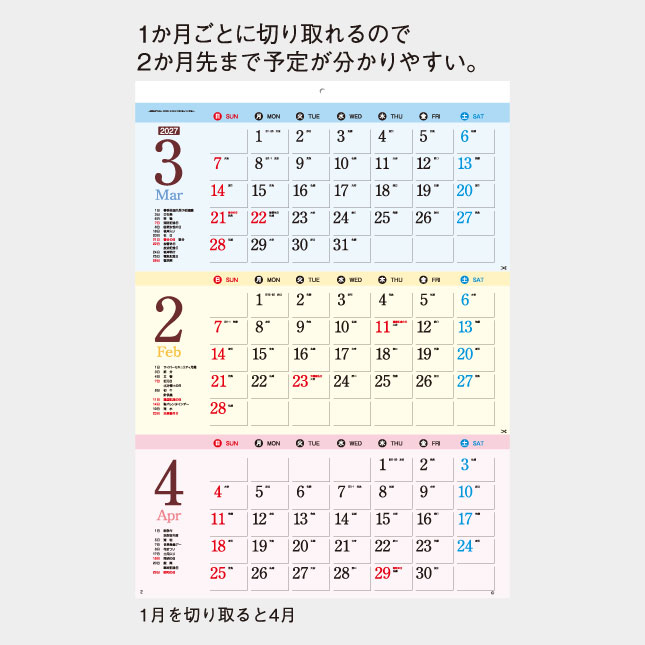 忙しいオフィスにとっては、長期スケジュールも書き込めて、見わたすことができるとても便利なカレンダーです。3ヶ月を常に表示しています。終わった月を切り取ることで後月が表れます。翌年の3月まで使うことができます。ピンク・黄・青で色分けしているので間違う事もなく、一度使うと手放せなくなるカレンダーです。