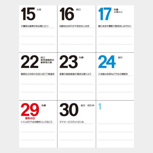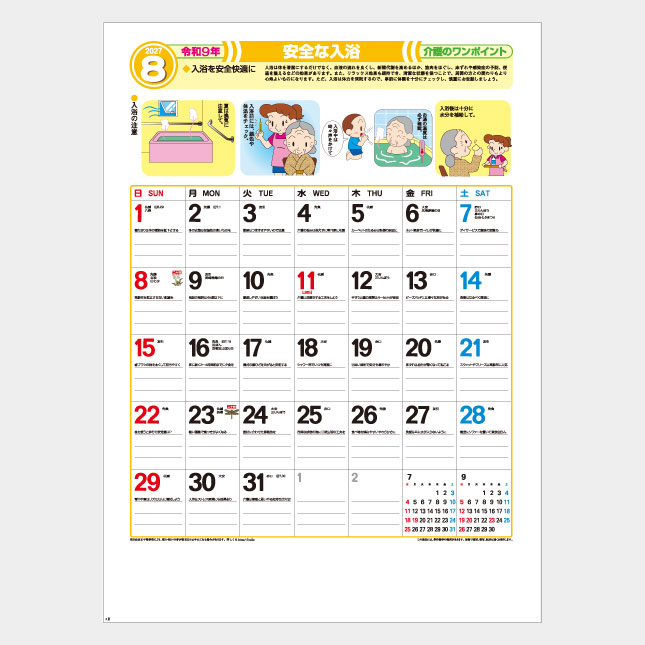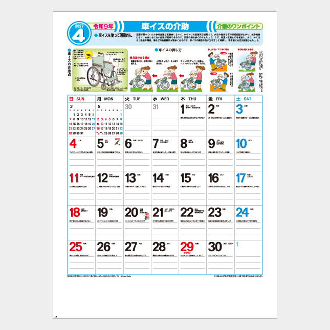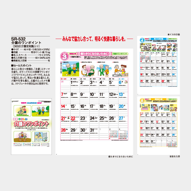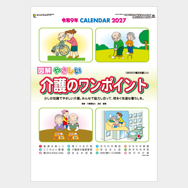 暮らしに役立つ情報を、「介護」にテーマを絞り、カラーイラストの図解でワンポイントアドバイスしたカレンダーです。
