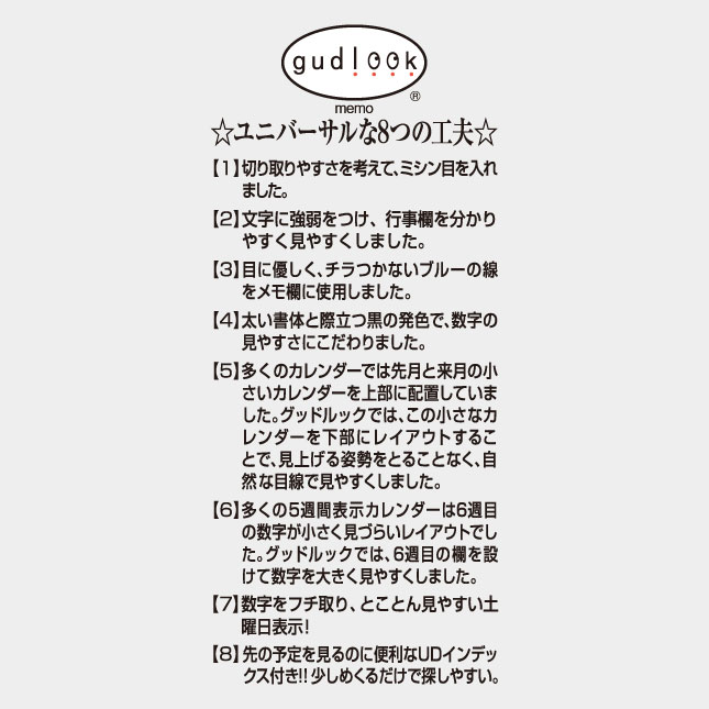 【5】多くのカレンダーでは先月と来月の小さいカレンダーを上部に配置していました。グッドルックでは、この小さなカレンダーを下部にレイアウトしたので、見上げる姿勢をとることなく、自然な目線で見やすくしました。