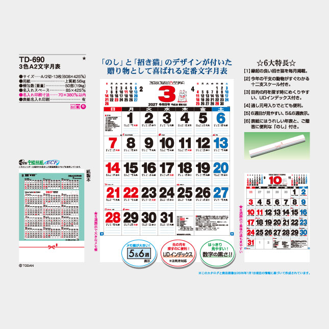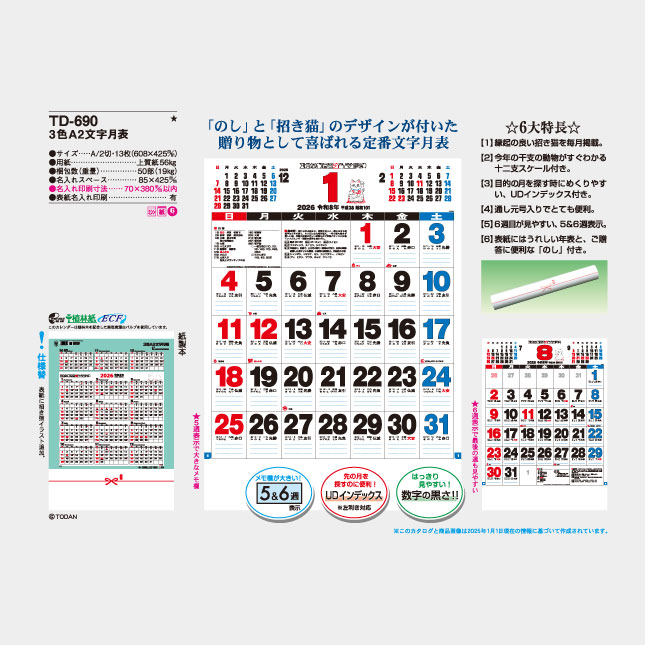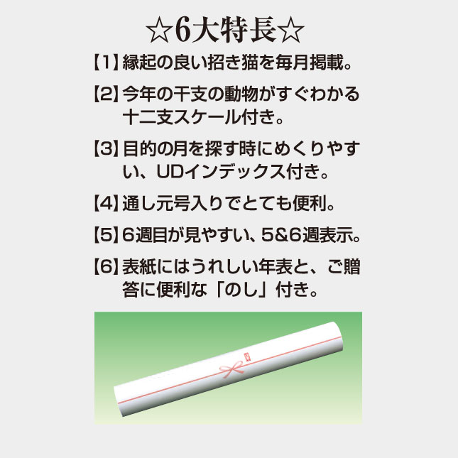 「のし」と「招き猫」のデザインが付いた贈り物として喜ばれる定番文字月表。