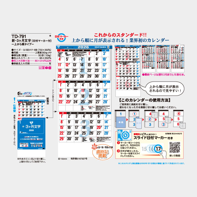 TD-791 新・3ヶ月文字-上から順タイプ- 文字月表 名入れカレンダー