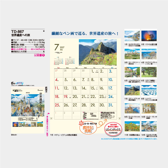TD-867 世界遺産への旅 壁掛け名入れカレンダーの特徴