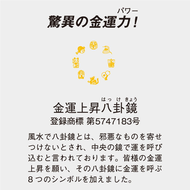 風水で八卦鏡とは、邪悪なものを寄せつけないとされ、中央の鏡で運を呼び込むと言われております。皆様の金運上昇を願い、その八卦鏡に金運を呼ぶ8つのシンボルを加えました。