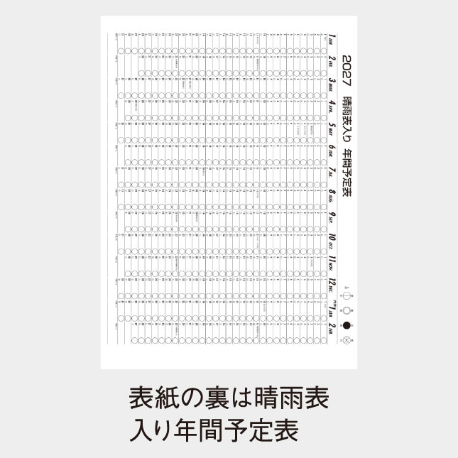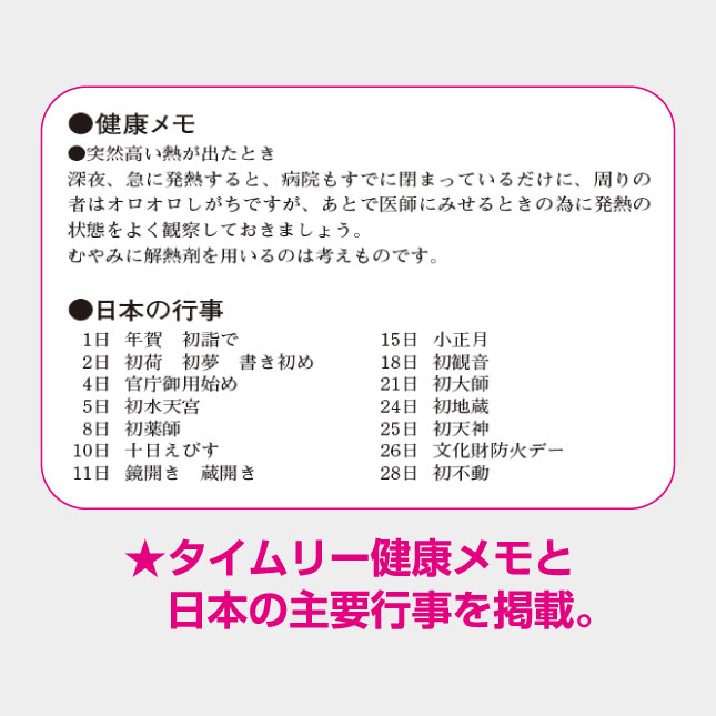表紙と中面の月玉部分は日本の紋様を現代風にアレンジし、落ち着きのある彩色で拡張高いカレンダーに仕上げています。大きく見やすい文字とたっぷりのメモスペースで実用性に富んだ3色文字月表です。