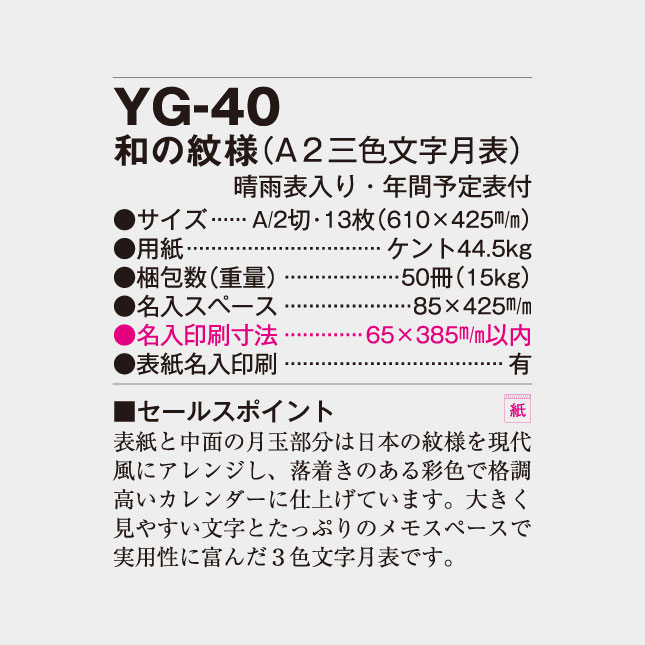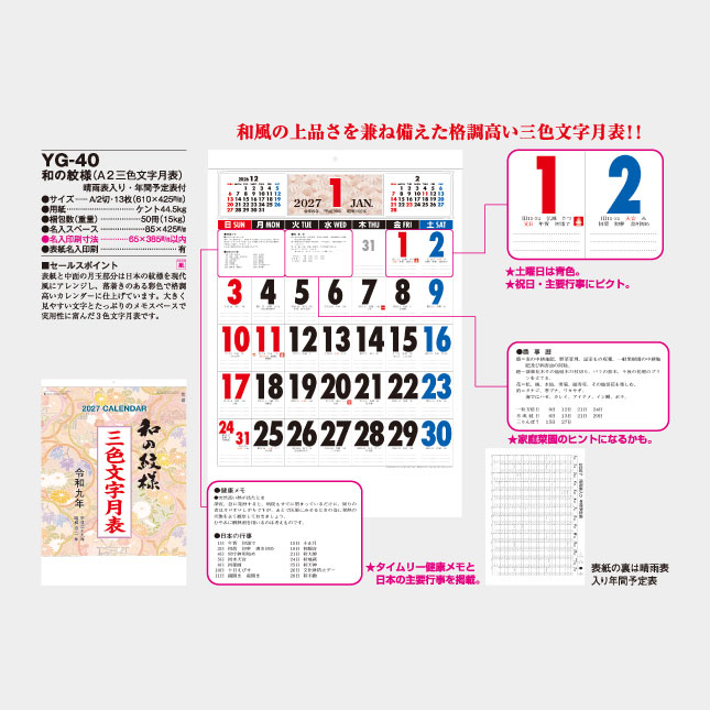 YG-40 和の紋様(A2三色文字月表) 文字月表 名入れカレンダー