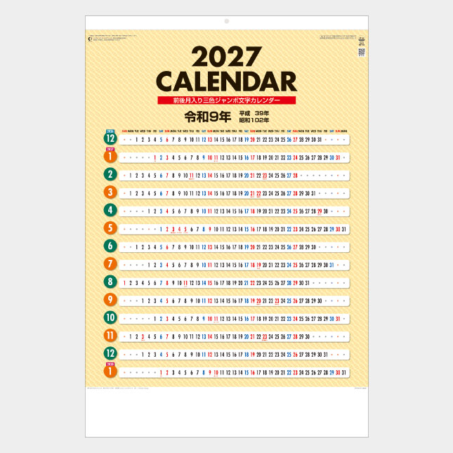 ※このカレンダーは『HB-103;NF-208 3色ジャンボ文字(前後月入り)』と同じ商品です。