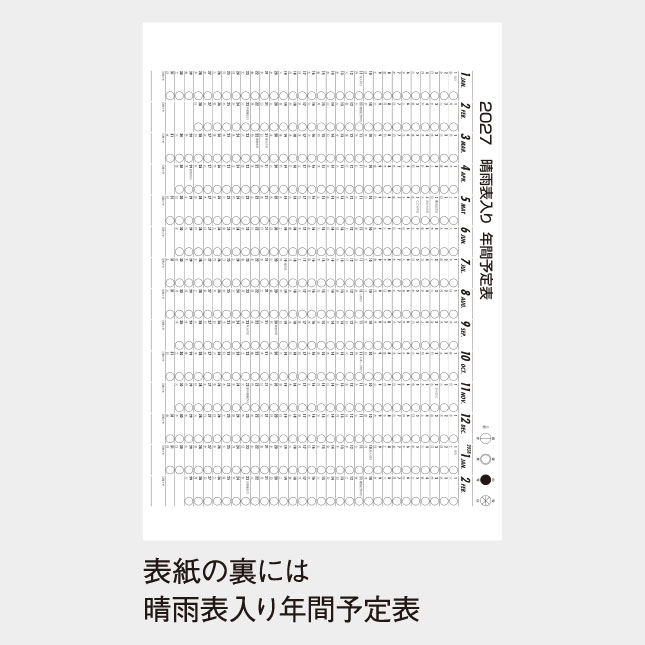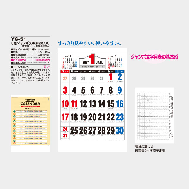 晴雨表、年間予定表付。B2カレンダーならではの視認性にすぐれた大きな3色文字と充実の暦。
