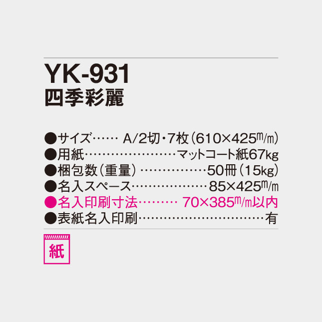 YK-931 四季彩麗 壁掛け名入れカレンダー